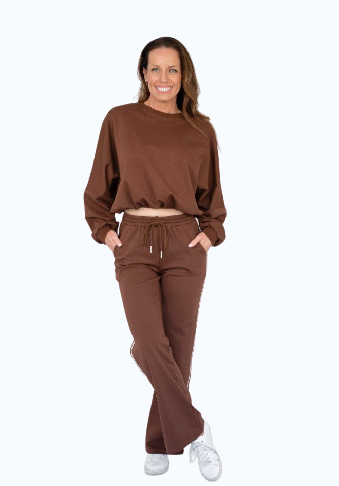 Our Dakota Jersey Pants in Chocolate! What we love most about these beauties that is they have the comfort and ease of track pants with the stylishness to be worn outdoors. Not to mention how cute their light pink stripe detail and side splits are!