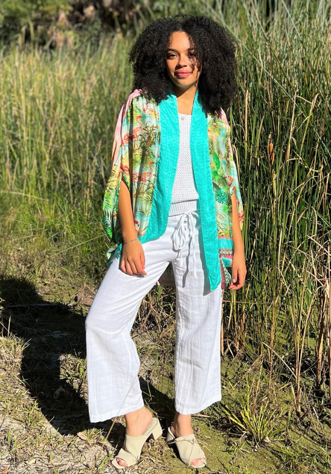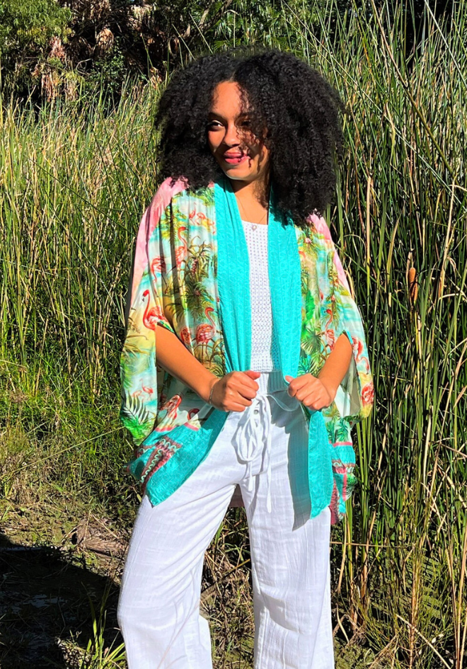 Sister to our Flamingo Dress is the Flamingo Cape in the same beautiful print. It’s the perfect addition to an all-white outfit for a fun pop of colour! It’s super lightweight with an oversized, relaxed fit that makes it easy to throw on to elevate a casual outfit.
