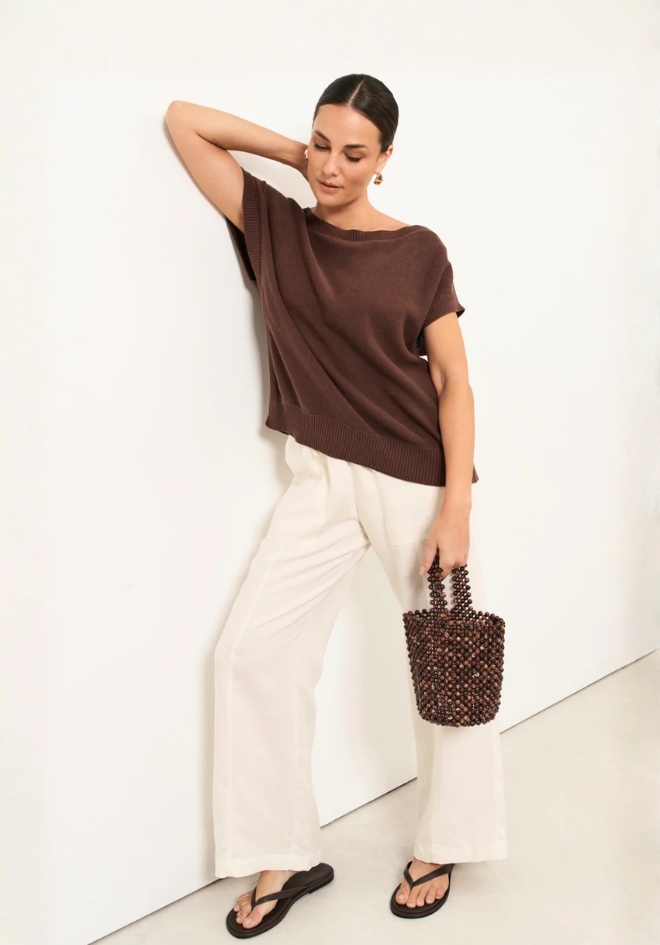Terrie Angled Neckline Cotton Knit Top - Chocolate